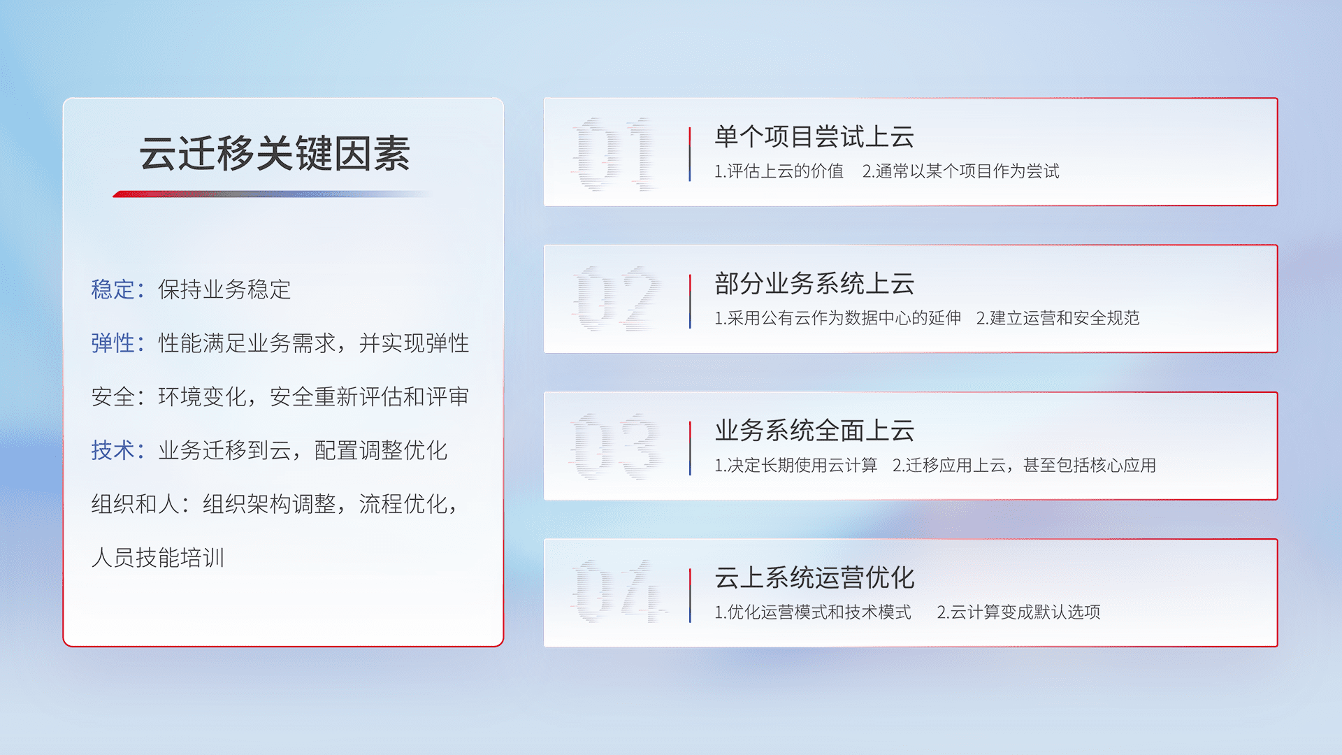 结合实际业务,,,,从规划设计、、云平台选型、、云原生改造、、、、数据迁移、、集成交付,,,迁移全过程为客户识别最佳上云路径,,,做好风险识别管理,,,,设计网络架构、、身份权限、、、安全审计合规、、、操作审计、、日志审计、、、监控告警策略、、、多站点容灾设计等,,对云上基础设施进行整体规划,,,提升IT治理水平,,,,以满足弹性、、高可用、、、高性能的需求。。。
